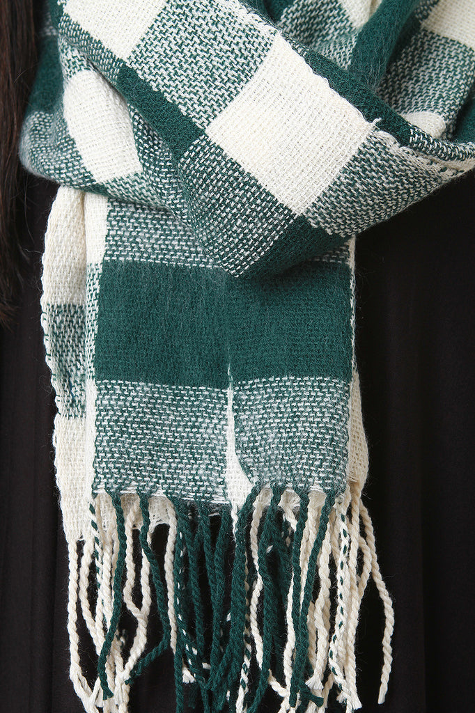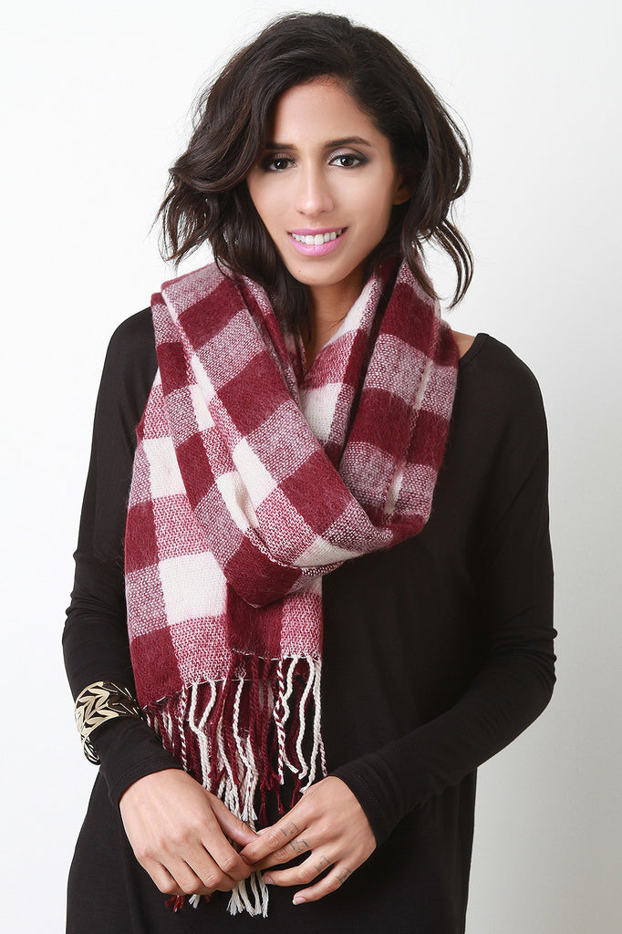 This two-tone plaid scarf features a gauze knit and fringe ends.