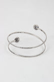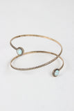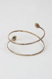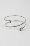 This bracelet features faux turquoise embelishments on the ends and spiral textured metallic wire band.
