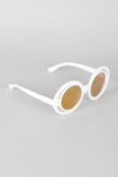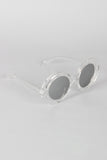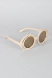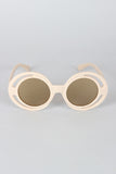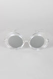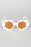 These sunglasses feature a bugs eye inspired design, cutout accents, round lenses, polished plastic framing.