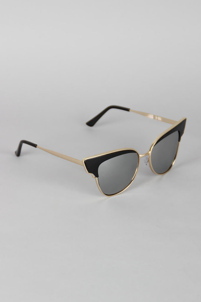 These sunglasses feature a butterfly wing silhouette design, metallic bridge and frame, and nose cushions.