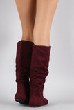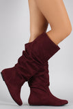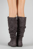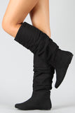 These cozy knee high boots feature a round toe silhouette, stitching accents, and slouchy shaft design. Finished with cushioned insole, soft interior lining, and easy pull on construction.