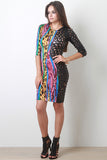 Featuring smooth stretch knit, abstract animal print, contrasting leatherette paneling with enlarged perforation, round neckline, three-quarter sleeves, and finished with stitching detail. Accessories sold separately. Made in U.S.A. 95% Polyester, 5% Spandex.