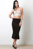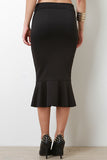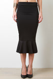 This sleek midi skirt features an elasticized waist, stretchy sculpture fit, and peplum hemline. Accessory sold separately. Made in U.S.A. 100% Polyester.