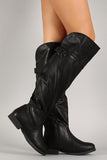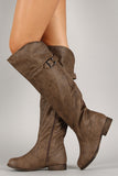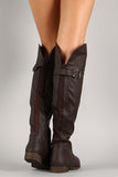 These stylish knee high boots feature a round toe, vegan leather upper with elastic insert at the back, buckle strap detail, stitching accents, and low heel. Finished with cushioned insole, smooth interior lining, and side zipper closure for easy on/off.