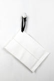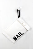 This envelope-shaped clutch features a flap with magnetic closure, adjustable wrist strap at back, and one interior zipper pocket. Finished with front lettering and reflective plate accents.