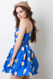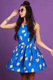 This fun tasteful dress features a square neckline, sleeveless design, spaghetti shoulder straps, racer back with a hidden zipper fastener, ruched waist seam, skater flare skirt, semi-sheer chiffon overlay, and ice cream pattern print throughout. Accessories sold separately. 100% Polyester.