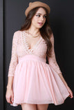 This bell-shaped dress features a v-neck floral lace top, half sleeves, and a voluminous skirt. Top unlined. Accessories sold separately. Made in U.S.A. 90% Nylon, 10% Spandex.