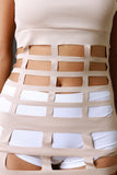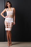 This dress features smooth stretch fabric, u-shaped neckline, halter straps, cut out grid design, and midi length. Accessories sold separately. Made in U.S.A. 95% Polyester, 5% Spandex.
