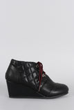 These designer inspired booties have a lace up and wedge heel silhouette; featuring a contrasting shoe lace. Designed with partial quilted sides. Finished with patch stitching on the front and back.