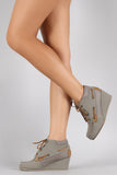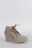 These wedge booties have a boat shoe silhouette; featuring mixed media design and tonal color blocking. It is lace up design. Finished with a lightly padded collar.