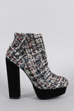 These fashionable ankle boots features a tweed fabric upper with sequin accents, almond toe silhouette, covered tribute platform, and chunky heel. Finished with cushioned insole, soft interior lining, and side zipper closure for easy on/off.