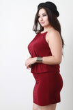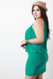 A plus size mini dress featuring smooth draping fabric, a round gathered neckline with adjustable tube chain shoulder strap, and elasticized waistline. Finished with keyhole back. Fully lined. Accessories sold separately. Made in U.S.A. 94% Polyester, 6% Spandex.