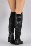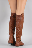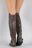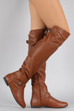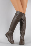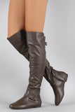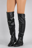 These boots are over-the-knee length, depending on personal height. Designed with a slouchy shaft; featuring a rear back lyrca piece for a custom fit with an adjustable buckle. Finished with a mini heel and an adjustable buckle across the vamp. Features faux fur lining.