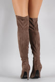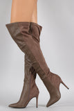 These over-the-knee length, depending on personal height. Designed with a combination of vegan suede and leather; featuring, a small inner side zipper. Pointy structure with a stiletto heel.