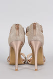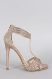 This gorgeous heel features a glitter upper with sparkling rhinestones accent, t-strap construction, open toe, and wrapped stiletto heel. Finished with lightly padded insole and rear zipper closure for easy on/off.