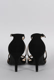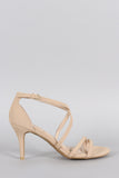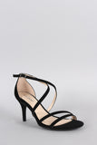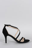 This glamorous heel features an open toe silhouette, strappy construction, wrapped kitten heel, crisscross ankle strap with buckle closure, and lightly padded insole for comfort.