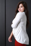 This plus size top features a jersey fabrication knit with a cross-over front, and a knotted necklace. Other accessories sold separately. Made in U.S.A. 95% Polyester, 5% Spandex.