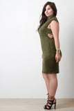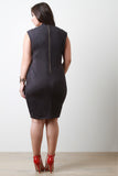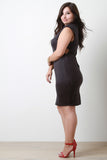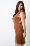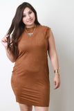 A plus size midi dress featuring soft faux suede, a mock neckline, and sleeveless sides with wide band. Finished with back zipper closure. Accessories sold separately. 90% Microfiber, 10% Spandex.