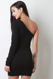 This bodycon dress features an off-the-shoulder neckline, left long sleeves, cinched seam waist with lace-up corset design, and zipper fastener at back. Accessories sold separately. 95% Polyester, 5% Spandex.
