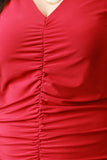 A plus size maxi dress featuring smooth fabric with ruched seam design, deep v-neckline, and fitted half sleeves. Finished with a high front vent. Includes a glossy gold-tone statement necklace with round faux stone pendant. Other accessories sold separately. 90% Polyester, 10% Spandex.