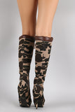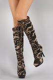 These trendy knee high boots feature an almond toe silhouette, camouflage print canvas upper, metal grommets with lace up front design, top stitching accents, tribute platform, and wrapped stiletto heel. Finished with cushioned insole, soft faux fur interior lining, and side zipper closure for easy on/off.