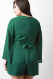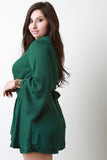 A plus size romper featuring a plunging v-neck surplice front, long wide sleeves, and an draping ruffled front. Finished with a self-tie bow at the back and concealed zipper closure. Accessories sold separately. 100% Polyester.