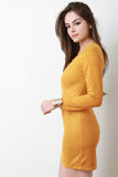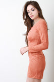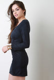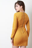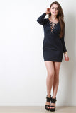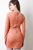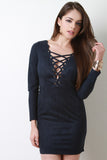 This dress features a vegan suede fabrication, plunging scallop v-neckline with corset lace-up, princess seam, long sleeves, and back zipper fastener. Accessories sold separately. 100% Polyester.