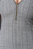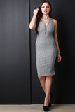 This sleeveless dress features a zipper v-neckline, stretchy sculpture fit, midi length hemline, and vertical ribbed knit fabrication. Accessories sold separately. Made in U.S.A. 97% Polyester, 3% Spandex.