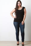 This plus size top features a round neckline, leopard print caged design at front, sleeveless construction, and straight hemline. Accessories sold separately. Made in U.S.A. 97% Rayon, 3% Spandex.