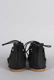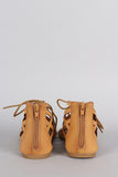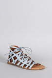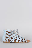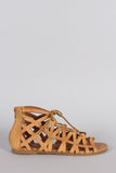 This flat sandal features an open toe silhouette, cutout caged design with lace up front, lightly padded insole, and rear zipper closure for easy on/off.