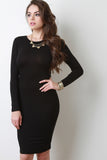 This sleek bodycon dress features a round neckline, long sleeves, backless design with lace-up construction, and a sculpture fit. Accessories sold separately. Made in U.S.A. 97% Modal, 3% Lycra.