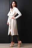 A long cardigan in ruffling crepe fabric with a splayed collar, long sleeves, and self-tie belt. Accessories sold separately. Made in U.S.A. 100% Polyester.