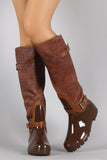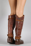 These knee high faux snake shaft, glossy PVC vamp with round toe, and vegan leather trim. Boots also have decorative buckled straps at collar and around ankle, a faux back zipper embellishment, and a lug sole low heel. Finished with a faux fur interior and side zipper closure for easy on/off.