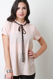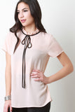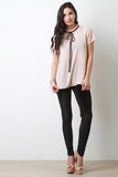 This top features semi-sheer fabric, ruffle mock neck, self-tie drawstring, short sleeves, and back keyhole cutout with button closure at nape. Accessories sold separately. Made in U.S.A. 100% Polyester.