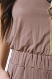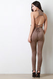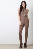 This jumpsuit features soft jersey knit, mock neckline, elasticized waist, open back with self-tie straps, and sleeveless construction. Accessories sold separately. 95% Rayon, 5% Spandex.