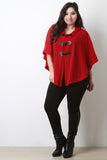 A plus size knit poncho featuring a hooded neckline, toggle closures at the front, and ribbed hem. Accessories sold separately. 95% Polyester, 5% Spandex.