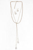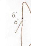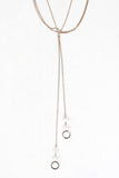 A delicate Y-shape necklace featuring layered cable chains, pearl bead accents, and glossy texture hoop pendants. Finished with an adjustable lobster hook closure and matching earrings. Lead and nickel compliant.