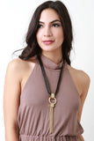 This striking necklace features a multiple rope cords gathered together with a chunky metallic chain and fringed tassel pendant. Finished with an adjustable lobster hook closure.