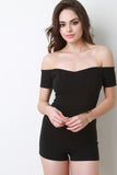 This romper features stretch fabric, off the shoulder sweetheart neckline, short sleeves, and back zipper closure. Accessories sold separately. 65% Rayon, 30% Polyester, 5% Spandex.