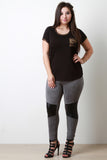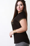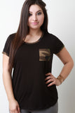 A plus size tee featuring a round neckline, short sleeves, and trim that matches the patterned breast pocket. Accessories sold separately. 97% Rayon, 3% Spandex.