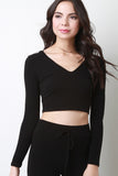 This hoodie top features a v-neckline, long sleeves, and a crop hemline. Accessories sold separately. Made in U.S.A. 48% Rayon, 48% Polyester, 4% Spandex.