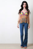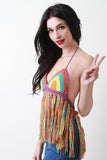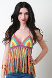 A crochet striped design, thin halter straps and back straps, and tasseled bottom hem. Cups are lined. Accessories sold separately. 100% Acrylic.