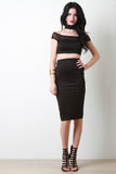 This dress features a boat neckline, semi-sheer mesh yoke, keyhole cutout at back, connected wide choker panel with hook-n-eye closure, and a crop hemline. Bottom features a seamless elasticized high waist design, stretchy sculpture fit, and a zipper back. Accessories sold separately. Made in U.S.A. 95% Polyester, 5% Spandex.