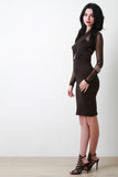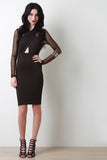 This bodycon dress features a crisscross halter construction, semi-sheer mesh long sleeves and back, double button closure at nape, keyhole opening at midsection, finished with a high waist cinch panel skirt. Accessories sold separately. Made in U.S.A. 92% Polyester, 8% Spandex.