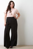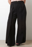 These plus size wide leg pants feature a smooth solid fabric, elastic waistband with ruching at the back, and petal design. Accessories sold separately. Made in USA. 100% Polyester.