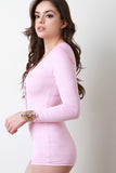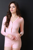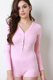 This  romper  features a snap button-up placket, v-neckline, and long sleeve design. Accessories sold separately. Made in U.S.A. 90% Polyester, 10% Spandex.