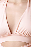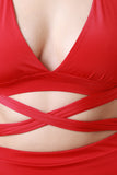 This two piece dress features a v-neck, long halter straps for a multi-way tie, crisscross front at crop hemline, and self-tie back. Skirt features a wide elasticized band, stretchy sculpture fit, and midi length hemline. Accessories sold separately. Made in U.S.A. 95% Polyester, 5% Spandex.
