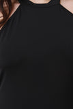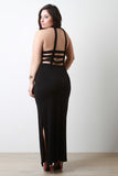 A sheath maxi dress featuring flowy georgette fabric, a high neck halter top, and an open back with strappy cage design. Finished with a side slit from the thigh down. Accessories sold separately. 95% Polyester, 5% Spandex.