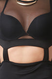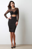 This midi dress features smooth stretch fabric, contrast semi-sheer mesh top, round neckline, long sleeves, cut out midriff design, and back zipper closure. Accessories sold separately. Made in U.S.A. 96% Polyester, 4% Spandex.