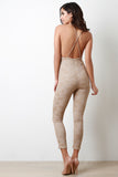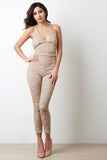 This jumpsuit features a v-neckline, spaghetti shoulder straps to a crisscross backless design, wide panel cinched waist seam, taper cut legs, and hidden zipper fastener at rear. Accessories sold separately. Made in U.S.A. 95% Polyester, 5% Spandex.